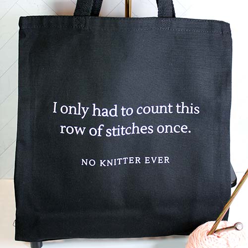 Show off your love of knitting (and a little humor) with the “I Only Had to Count This Row of Stitches Once – No Knitter Ever” tote bag. This playful design features a relatable quote that every knitter can appreciate. It’s a must-have accessory for yarn lovers and a great way to carry your projects in style.
