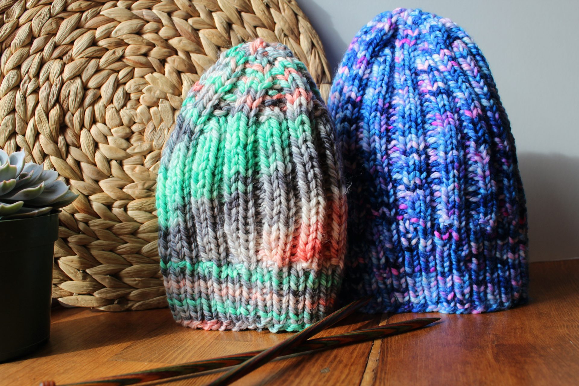 Sometimes it’s difficult to know exactly the size of someone’s head that you are making a hat for. Insert the Very Vital Ribbed Beanie. The beanie’s generous stretch can really act as a One-Size-Fits-Most type of hat. Because of the stretch with the edge, the beanie’s sizing really depends on the length you decide to make the initial ribbed section before the decreases.